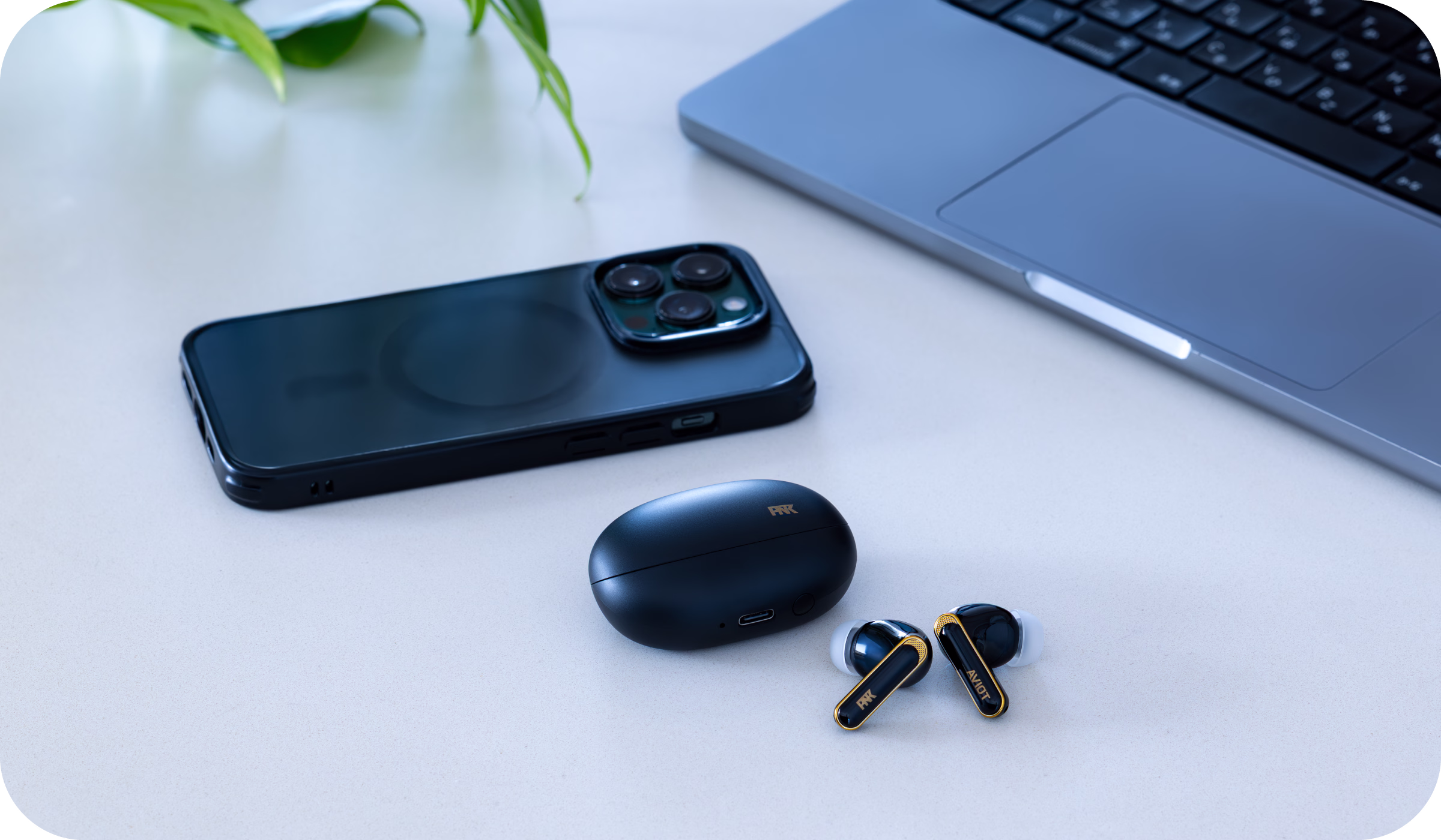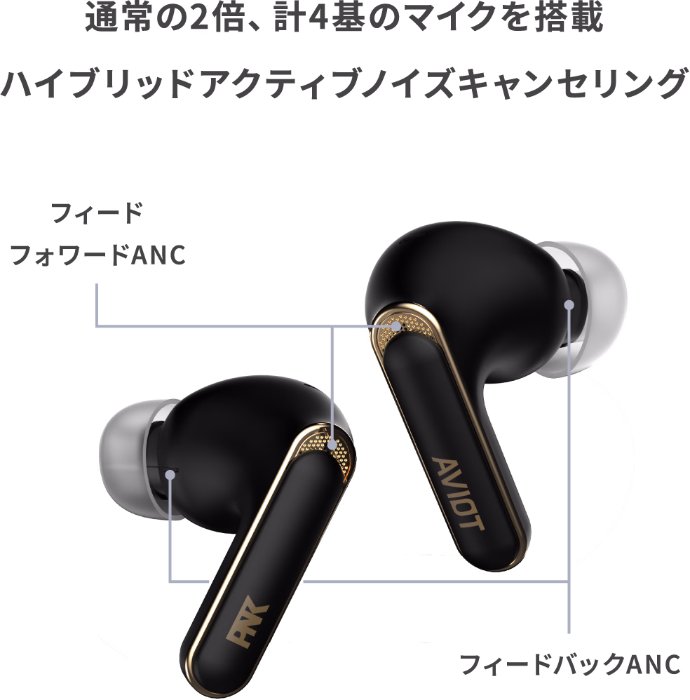 さらにノイズキャンセリングによる音質への影響をより軽減するAVIOT独自のアルゴリズムを搭載。騒音でかき消されやすい低中音域を中心に広帯域でノイズを軽減。電車や車の走行音、街中の雑踏や人の話し声といった環境音が気になる場所でも静寂をつくり出し、かつてない没入感を実現します。