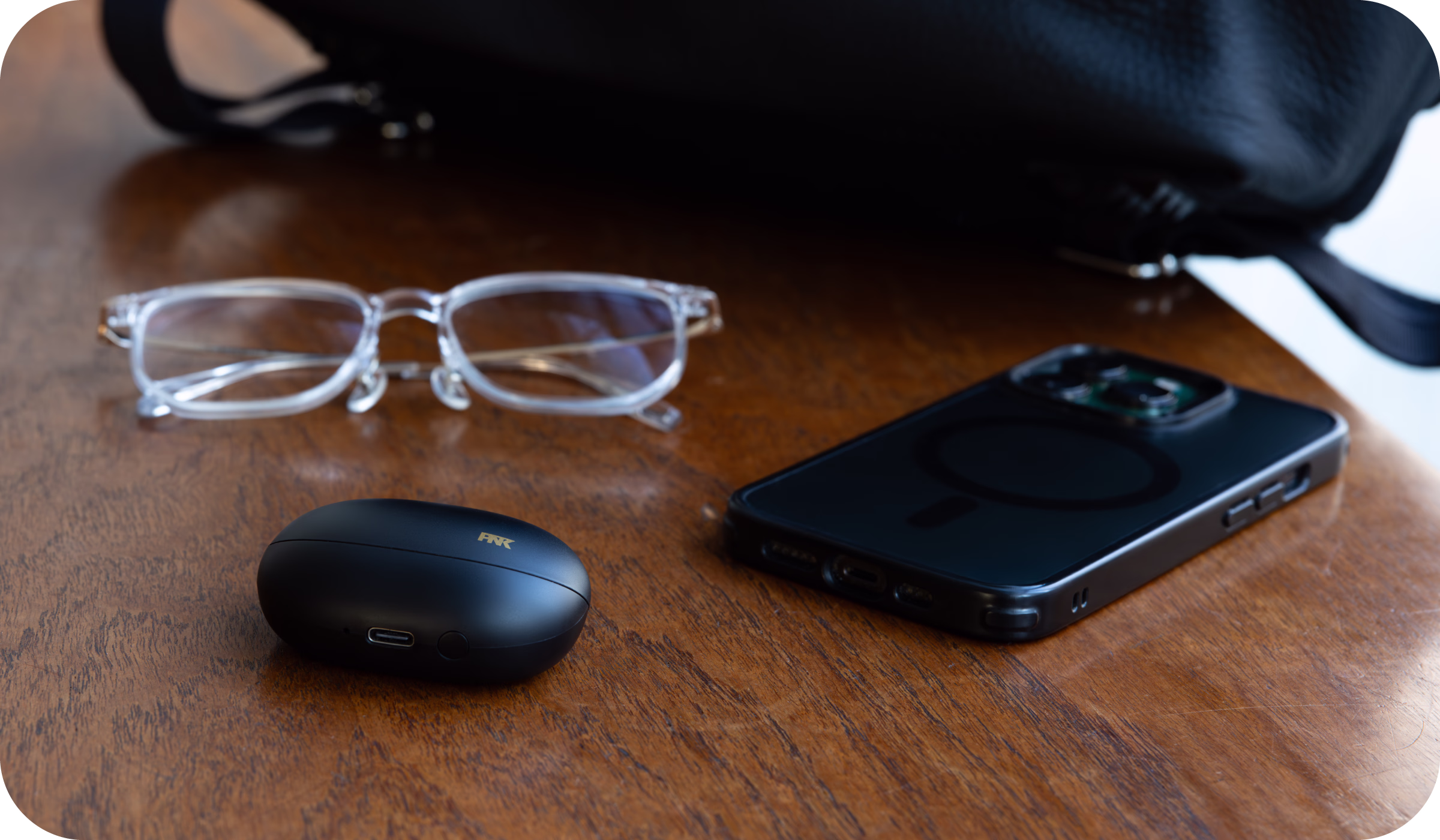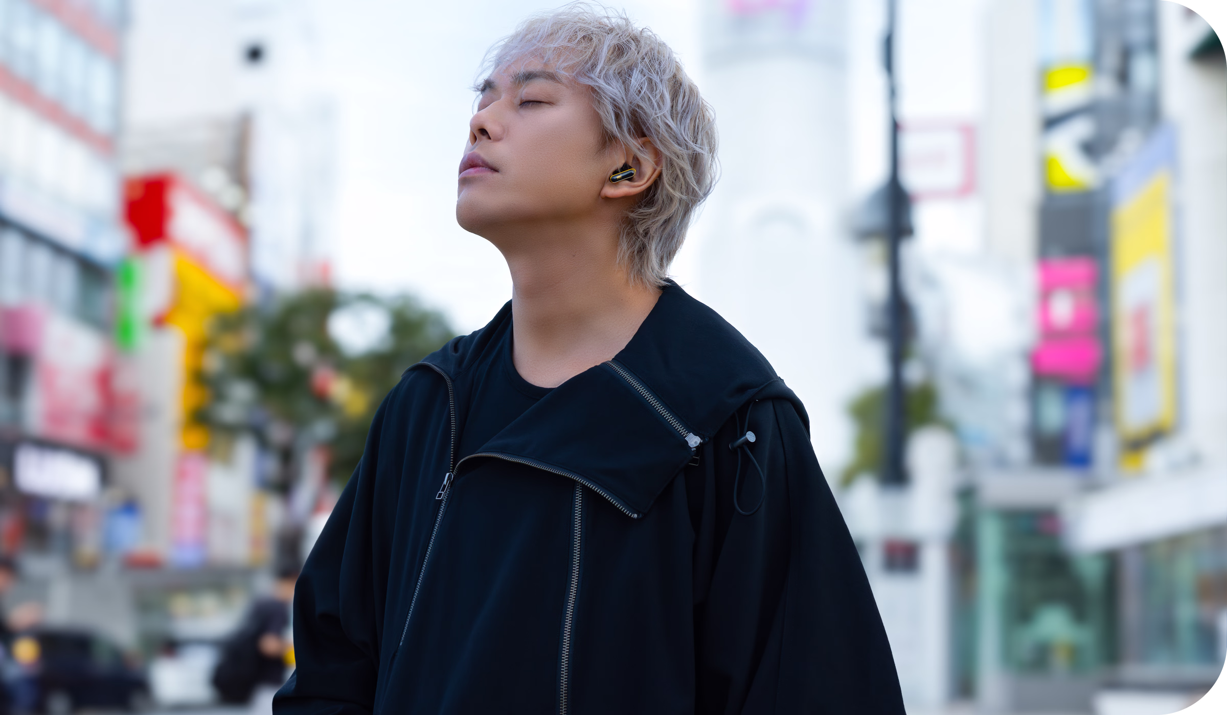 コラボレーションならではの特別仕様として、PNKシリーズを象徴するブラックとゴールドの配色を継承。落ち着きのある艶感をたたえたチャージングケースと、光沢感のあるブラックとゴールドの組み合わせが上質感を醸し出すイヤホン本体のコントラストは、PNKシリーズにふさわしい洗練された美しさを感じさせるデザインです。