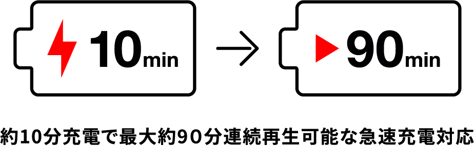 - 約1.5時間約10分の充電で最大90分再生可能な急速充電対応