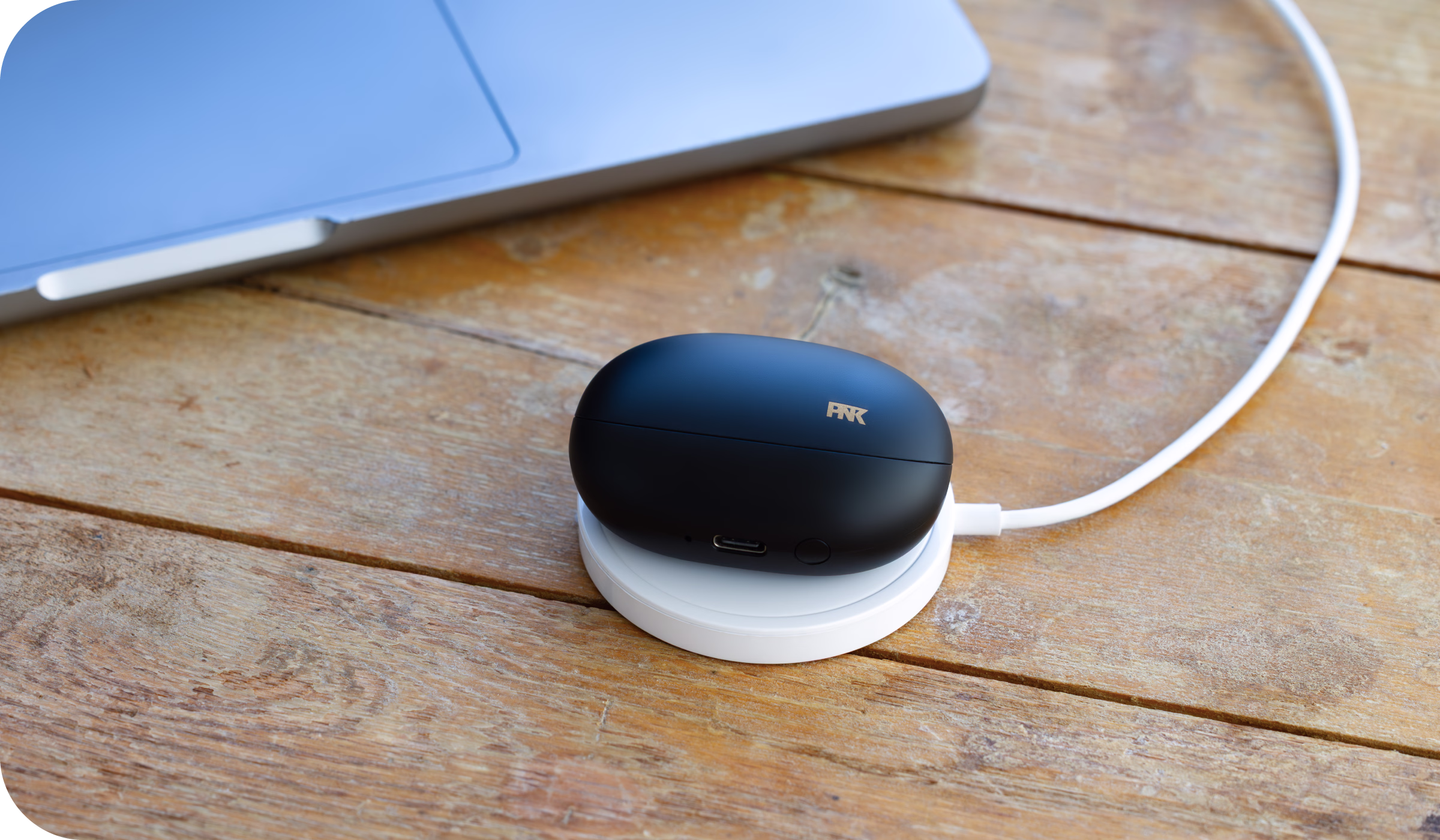 チャージングケースは、ポケットやポーチに入れて持ち運びがしやすい薄型設計。イヤホン自体の機能性を損なわず、普段使いのしやすいサイズ感にまとめました。