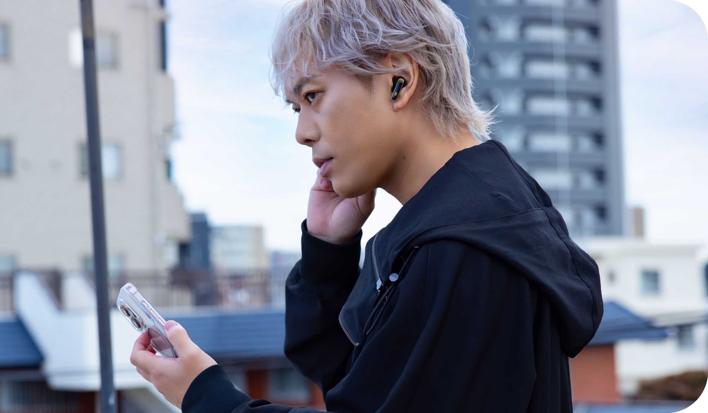 イヤホンを外すことなく、ワンタップで周囲の音を聞くことができる外音取込モードを搭載。交通量の多い道路など周囲の音を聞きたいシーンや、イヤホンをつけたまま会話をする際にも便利な機能です。