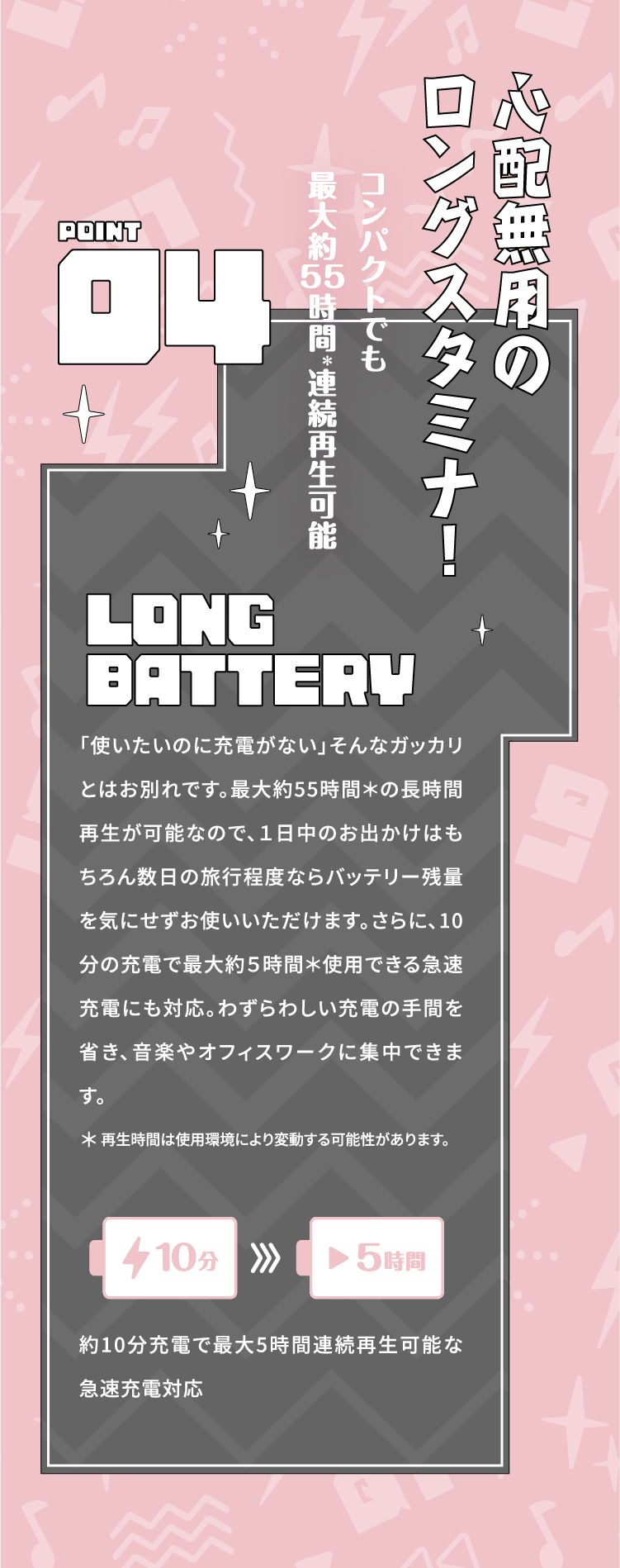 Bluetooth接続時 約55時間使用環境により変動する可能性があります